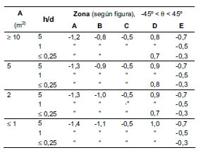siendo k, L, Z parámetros característicos de cada tipo de entorno, según la tabla adjuntaGrado de aspereza del entorno k L (m) Z (m) I Borde del mar o de un lago, con una superficie de agua en la dirección del viento de al menos 5 km de longitud 0,156 0,003 1,0 II Terreno rural llano sin obstáculos ni arbolado de importancia 0,17 0,01 1,0 III I Zona rural accidentada o llana con algunos obstáculos aislados, como árboles o construcciones pequeñas 0,19 0,05 2,0 IV Zona urbana en general, industrial o forestal 0,22 0,3 5,0 V Centro de negocios de grandes ciudades, con profusión de edificios en altura 0,24 1,0 10,0 cp= el coeficiente eólico o de presión , dependiente de la forma y orientación de la superficie respecto al viento, y en su caso, de la situación del punto respecto a los bordes de esa superficie; un valor negativo indica succión. Existen tablas para cada tipología de fachada o cubierta, la tabla adjunta es para la fachada vertical.