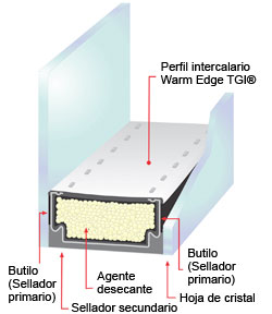 El termino Warm Edge indica la interacción térmica del cristal, el marco de la ventana y el perfil intercalario en el sellado periférico en cristales de cámara. Si las pérdidas energéticas entre exterior e interior de la ventana son pequeñas, aunque la temperatura exterior sea baja, se habla en las regiones perimetrales de un Warm Edge (Canto del cristal cálido). Por regla general, se puede decir que el uso de un sistema Warm Edge, permite una mejor regulación de la temperatura interior independiente de la temperatura exterior, contribuyendo al ahorro energético de manera notable. En este contexto, cabe destacar el importante papel que desempeña la calidad aislante del perfil intercalario utilizado. El perfil intercalario de TGI® ha sido clasificado como Warm Edge de acuerdo con la normativa DIN V 4108-4. |